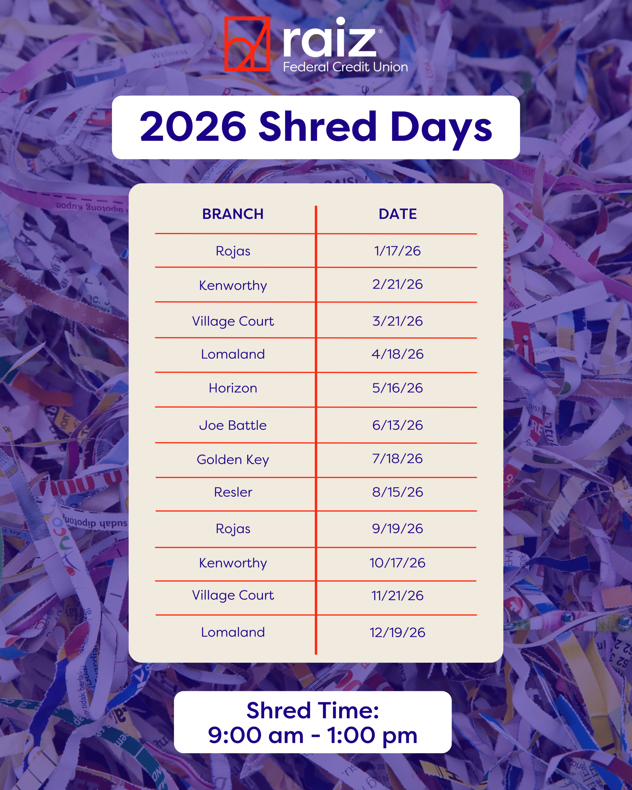 Bring your paper documents and let the professionals take care of shredding and disposing of them properly. Raiz Shred Days are free and held exclusively for members (limit of